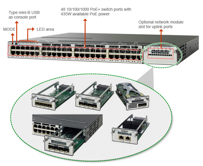 این سوئیچ دارای 48 پورت به صورت گیگ poe بوده و توان خروجی هر پورت 16.5 وات می باشد برای روشن هر کردن دستگاه می توان از آن استفاده نمود . آپ لینک این دستگاه به صورت ماژولار است که برابر نیاز خود باید یکی از کارت های ماژول این دستگاه را جداگانه خریداری نمود . ios روی این دستگاه از نوع IP base می باشد که تفاوت ios های سیسکو را می توانید در ادامه مطالب رویت نمائید .