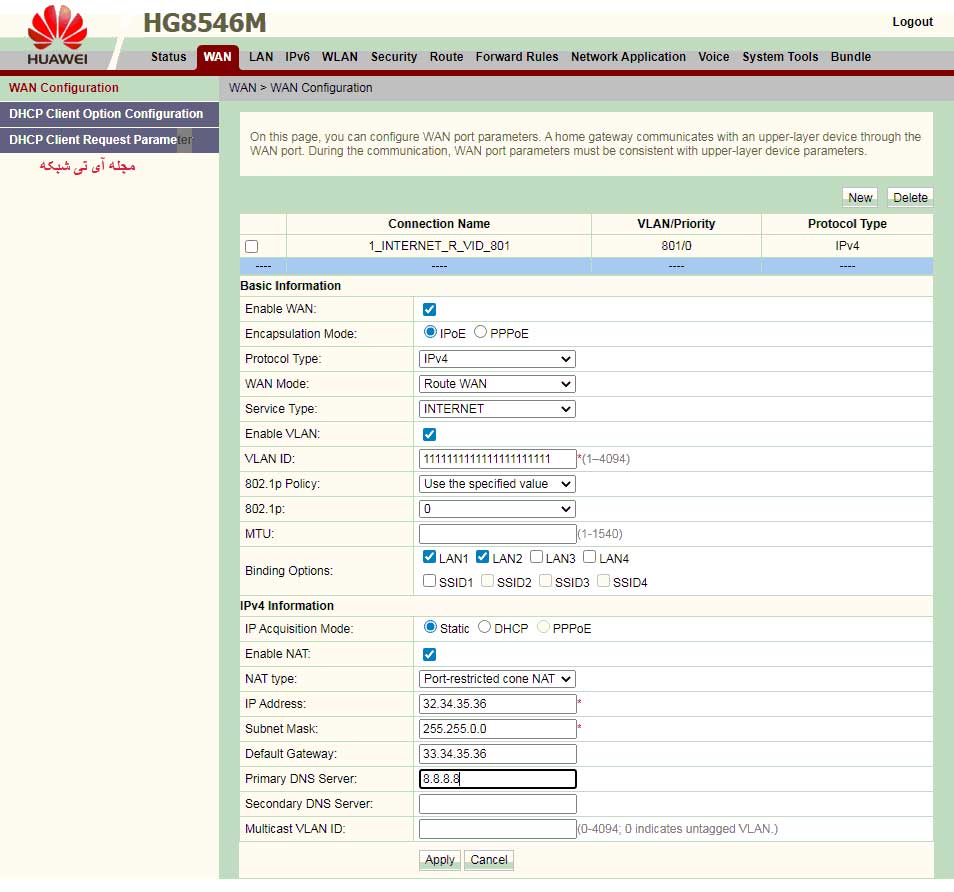 6- تنظیمات مودم فیبر نوری مخابرات را به شرح ذیل انجام دهید :